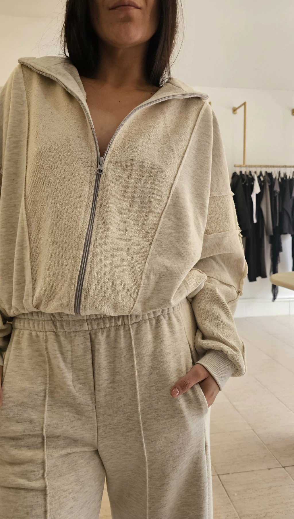 Campera confeccionada en rustico con capucha, recortes al corte con cierre en el medio y elastico en cintura.